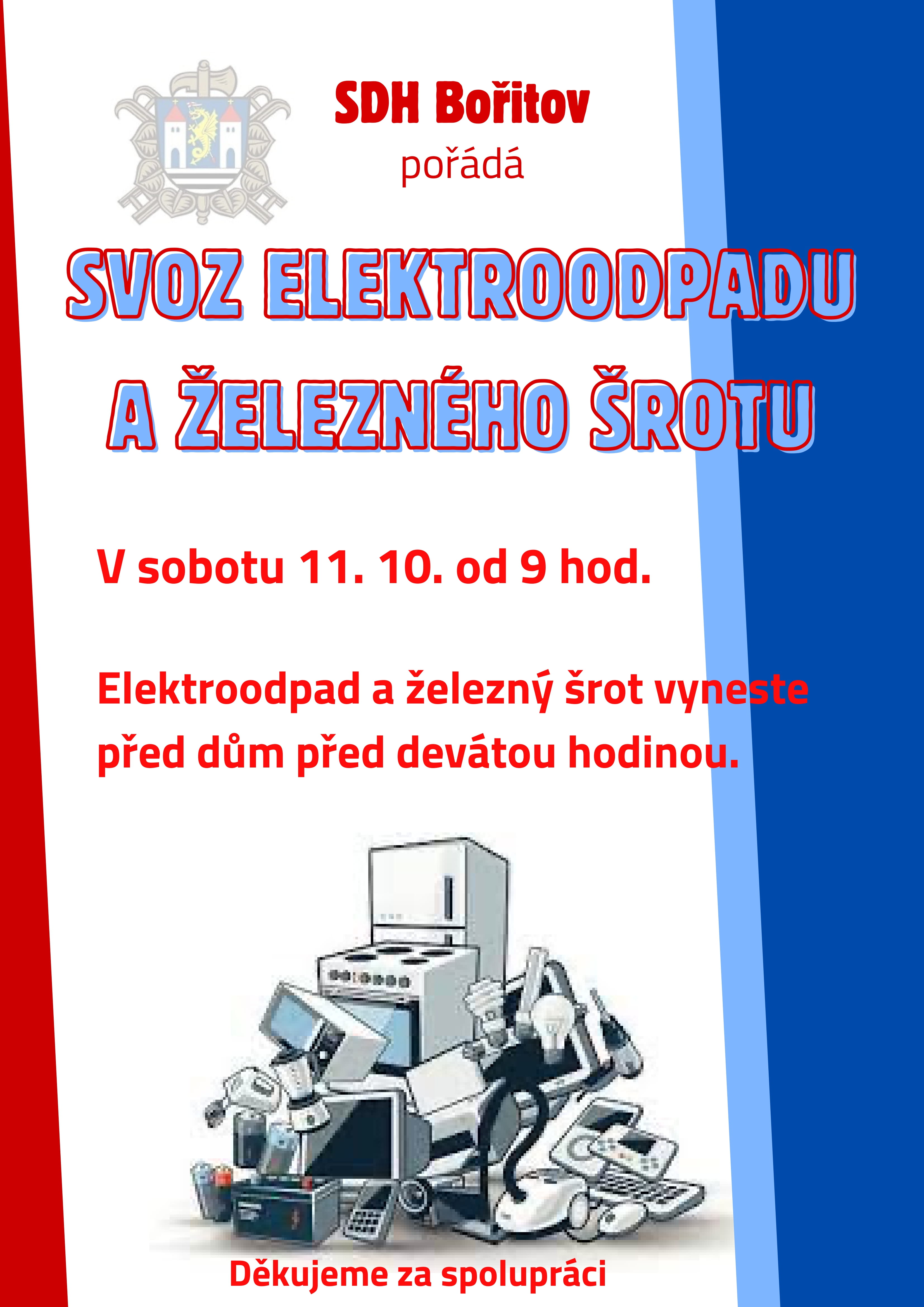 SDH Bořitov bude opět pořádat sběr elektroodpadu a nově i železného šrotu. Sběr uskutečníme v sobotu 11.10.2025 od 09:00 hodin.